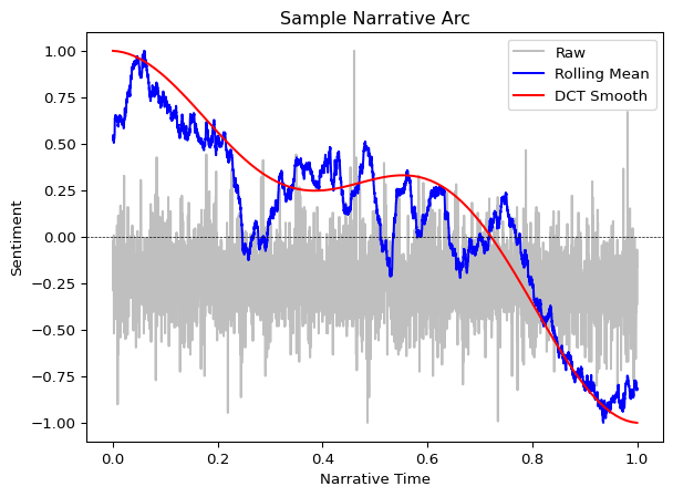 • Plots highlight the story arc. Built-in smoothing turns raw sentence scores into the gentle curves popularized by syuzhet, making it easy to point at climaxes, reversals, and endings during analysis or teaching.