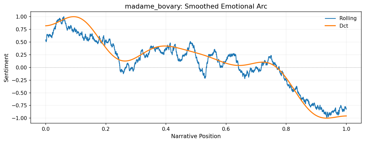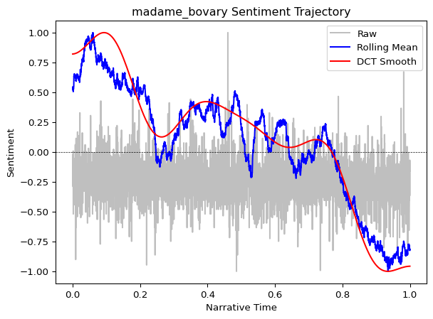 By scoring the sentiment of each sentence in a novel and smoothing those scores, we can visualize the narrative arc—the trajectory of emotional valence from beginning to end. Research has shown that stories cluster around a small number of archetypal shapes (Reagan et al. 2016), and that analyzing these arcs can reveal otherwise hidden structures in narrative (Elkins 2025; Hu et al. 2020).