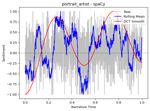 Both methods typically reveal similar overall narrative shapes, though spaCy’s scores may be more nuanced. For literary analysis focused on broad narrative structure, dictionaries often suffice.