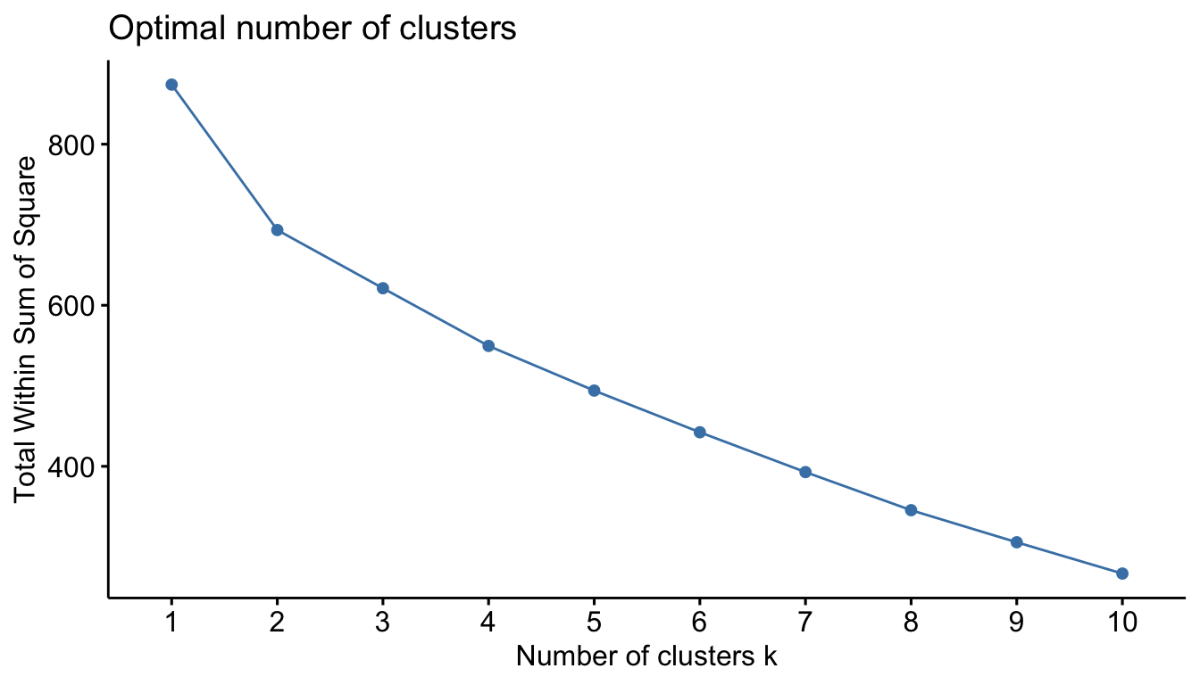We can also “cut” our dendrogram in any number of clusters. The question is: How many clusters are optimal. Here, we can use some plotting functions that are part of the factoextra package. The first is the familiar “elbow” method.
