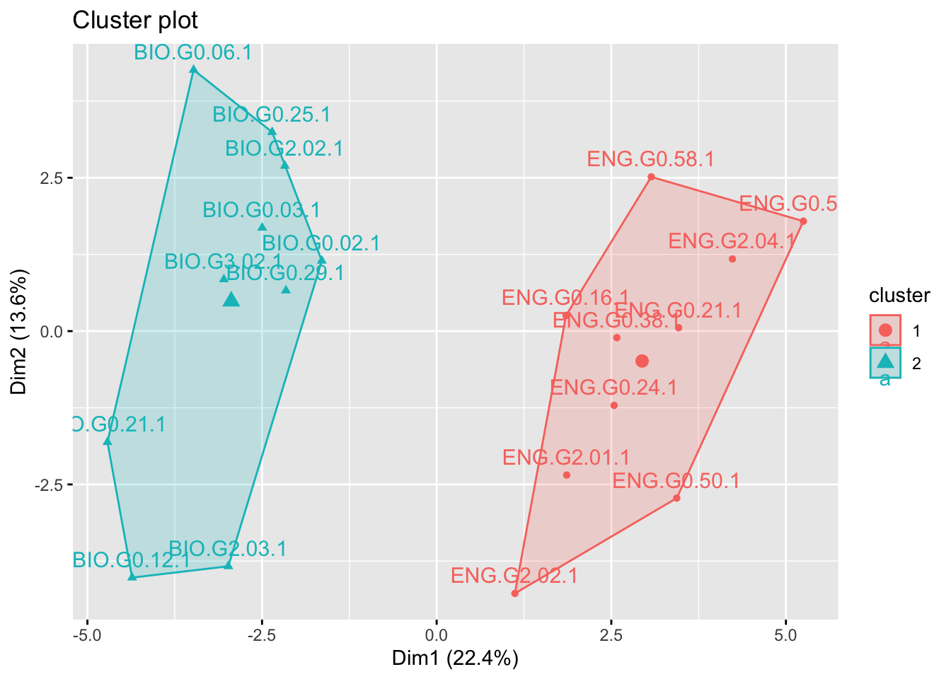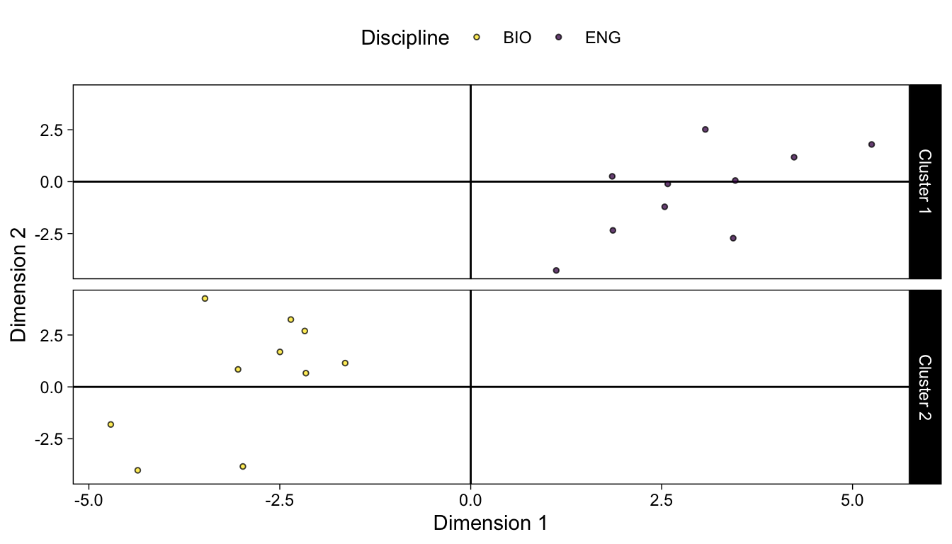 We can also extract the coordinates for the 2 principal components and create a data frame. We’ll also add columns for discipline and cluster membership.