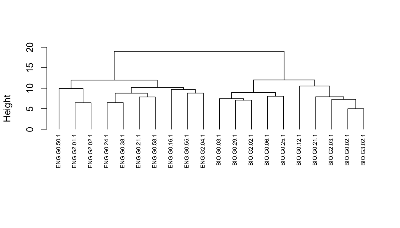 Our clustering will be based on part-of-speech counts, so we need to parse some data using udpipe. First, we’ll load the micusp_mini corpus from the cmu.textstat packageand subset out the Biology and English papers.