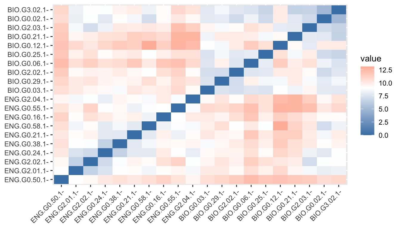 fviz_dist(d, gradient = list(low = "steelblue", mid = "white", high = "tomato"))Warning: `aes_string()` was deprecated in ggplot2 3.0.0.