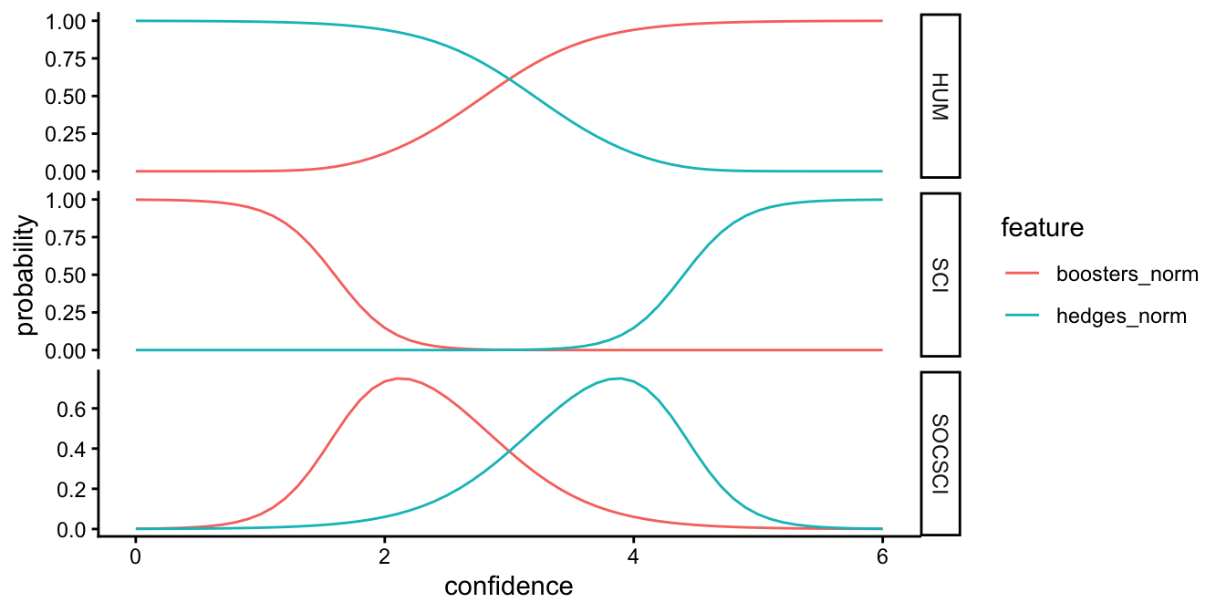 pivot_longer(HUM:SOCSCI, names_to = "variable", values_to = "probability")Finally, we’ll create a plot the probabilities and color by hedges & boosters.